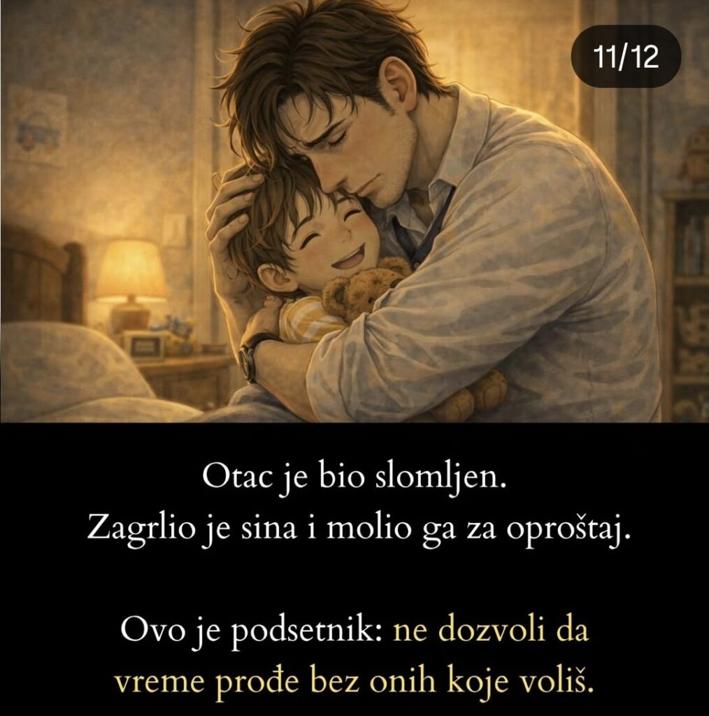 **Koliko ‘košta’ moj tata? Dirljiva priča koja je rasplakala region**Čovek se vratio s posla kasno, umoran i nervozan. Na vratima ga je čekao njegov petogodišnji sin, stežući plišanog medu u rukama.„Tata, mogu li nešto da te pitam?“ „Da, naravno, reci, šta je?“ „Tata, koliko zarađuješ na sat?“ Otac ga je pogledao iznenađeno. „To se tebe ne tiče. Zašto me to pitaš?“ Dečak je tiho odgovorio: „Samo sam želeo znati. Molim te, reci mi koliko zarađuješ na sat?“ Nakon kraće pauze, otac je rekao: „Ako već moraš znati, zarađujem 50 eura na sat.“Dečak je spustio glavu. „Oh…“ Zatim je dodao: „Tata, molim te, možeš li mi pozajmiti 25 eura?“Otac je planuo: „Ako je jedini razlog što me pitaš da ti pozajmim 25 eura taj da možeš kupiti igračku ili neku besmislicu, idi u sobu i razmisli zašto si tako sebičan!“Dečak je tiho otišao u svoju sobu i zatvorio vrata.Nakon nekog vremena, otac se smirio i počeo razmišljati: „Možda mu je stvarno nešto trebalo…“Otišao je u njegovu sobu. „Jesi zaspao, sine?“ „Ne, tata, budan sam.“ „Možda sam bio prestrog… Evo ti 25 eura.“Dečak se nasmešio i posegnuo ispod jastuka, izvukavši novac koji je već imao.Otac se ponovo naljutio: „Zašto si tražio još, ako već imaš?“ Dečak ga je pogledao i tiho rekao: „Zato što nisam imao dovoljno… a sada imam.“Držeći novčanice u ruci, dodao je: „Tata, sada imam 50 eura. Mogu li kupiti sat tvog vremena? Dođi sutra ranije. Želim da se igram sa tobom.“—Ova jednostavna, ali snažna priča podseća na ono što često zaboravljamo – deci nisu potrebne skupe igračke, već naše vreme, pažnja i ljubav.Jer za njih, naš jedan sat – nema cenu.